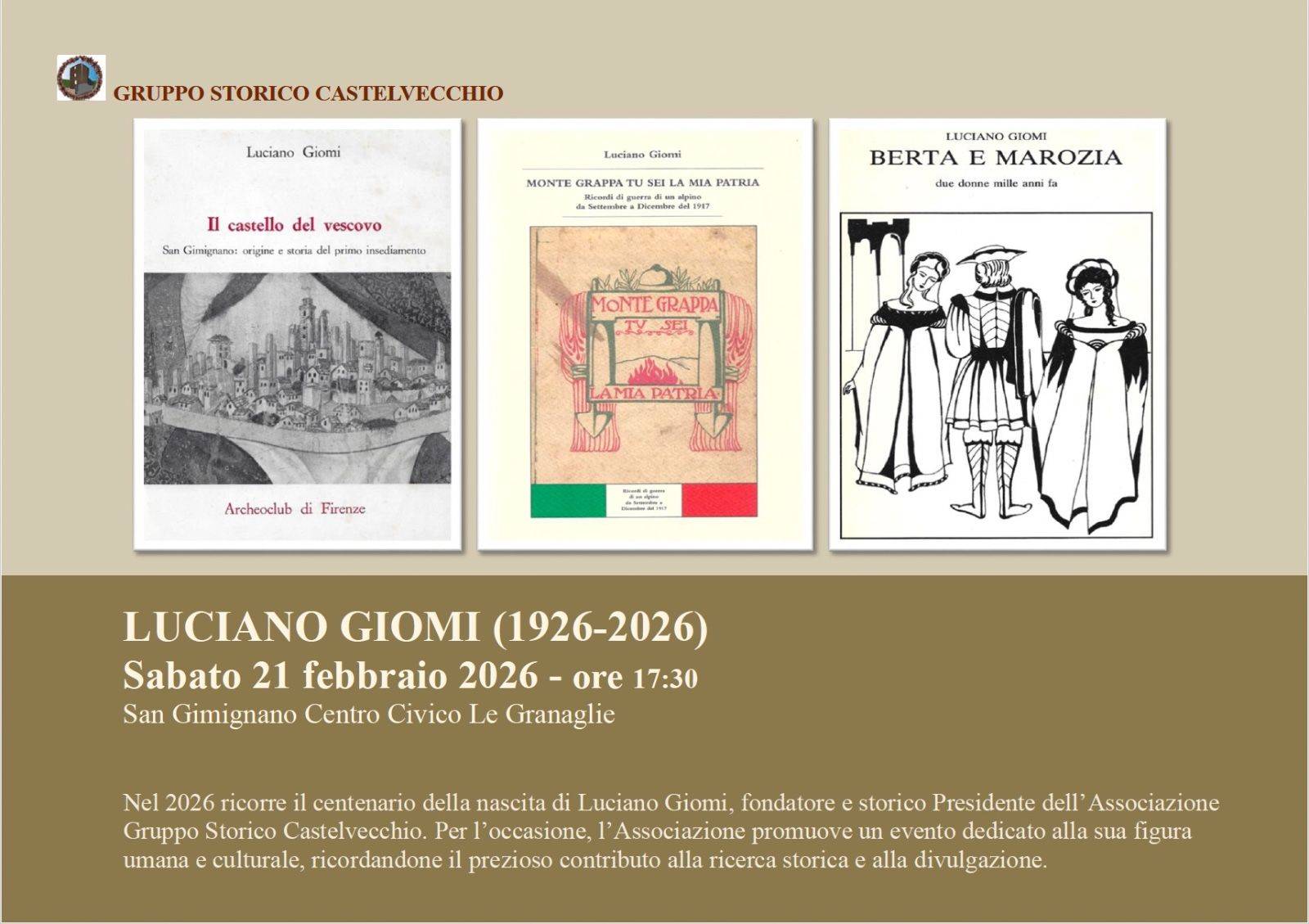 Nel centenario della nascita di Luciano Giomi, l’Associazione Gruppo Storico Castelvecchio rende omaggio al suo fondatore e storico presidente, ricordandone la figura umana, l’impegno culturale e la vasta produzione letteraria L’evento al quale sei invitato, si terrà il 21 febbraio 2026 alle ore 17:30, presso il Centro Civico “Le Granaglie� di San Gimignano. Evento aperto a tutti fino ad esaurimento posti.
